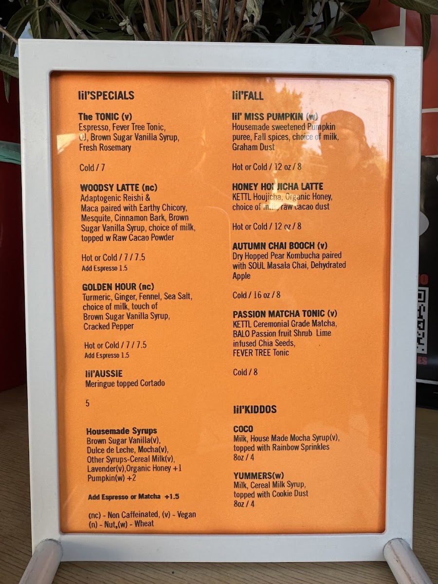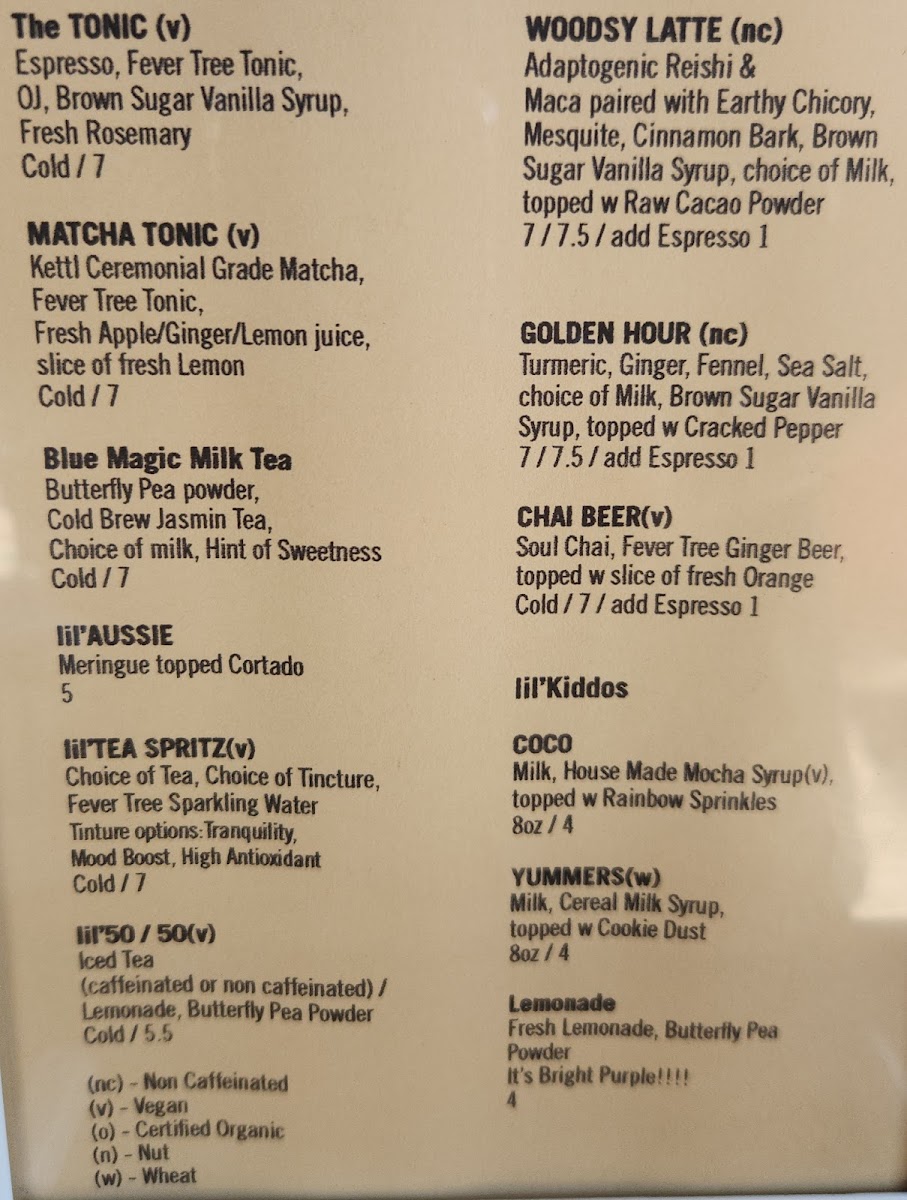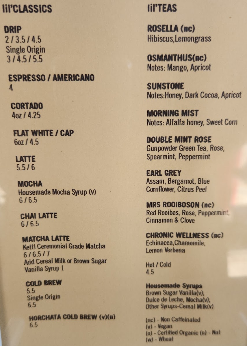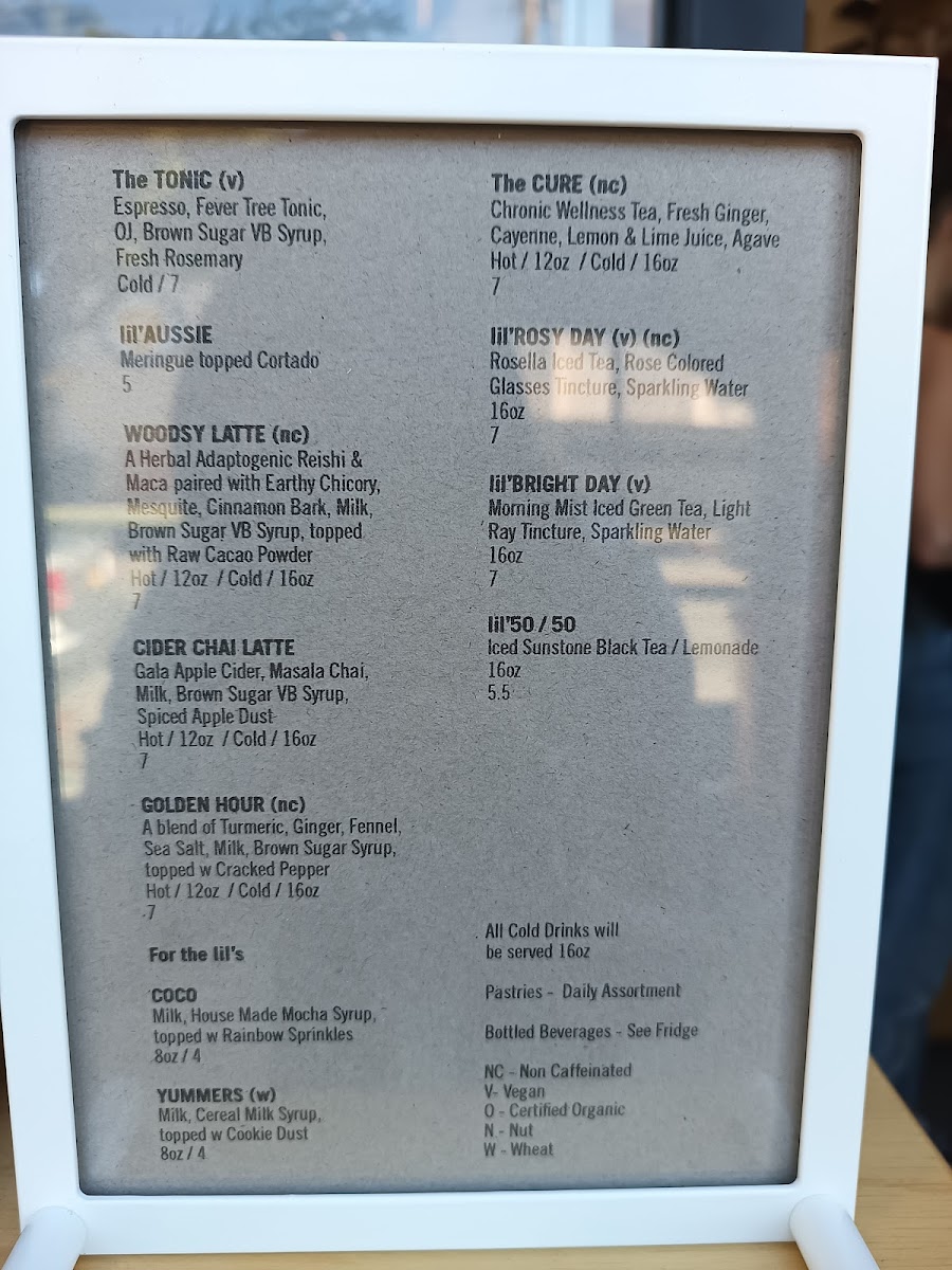 The menu features a variety of coffee and specialty drinks, including options such as cold brews, lattes, and unique beverage choices like horchata and matcha sodas. Alongside the drink selection, there are light food items available, primarily focused on pastries and bread. The offerings are well-suited for breakfast, coffee breaks, or light meals throughout the day. Given the nature of the cafe, the menu accommodates quick ordering and takeout, with some limited outdoor seating for casual enjoyment.